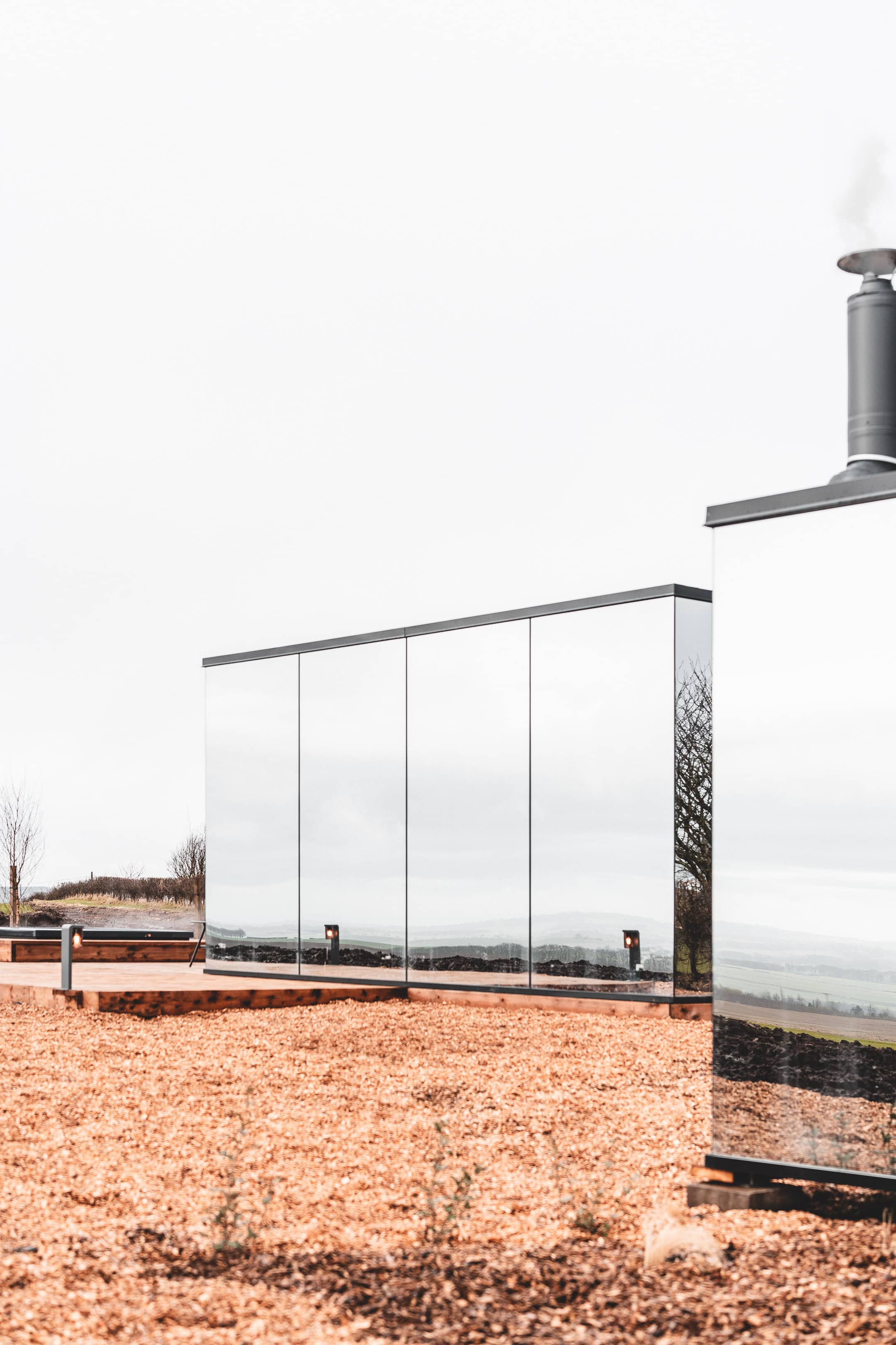 Gwiwer is a serene, design-led mirrored cabin set within the Anglesey countryside. Minimal and refined, the space offers a calm retreat from everyday pace.