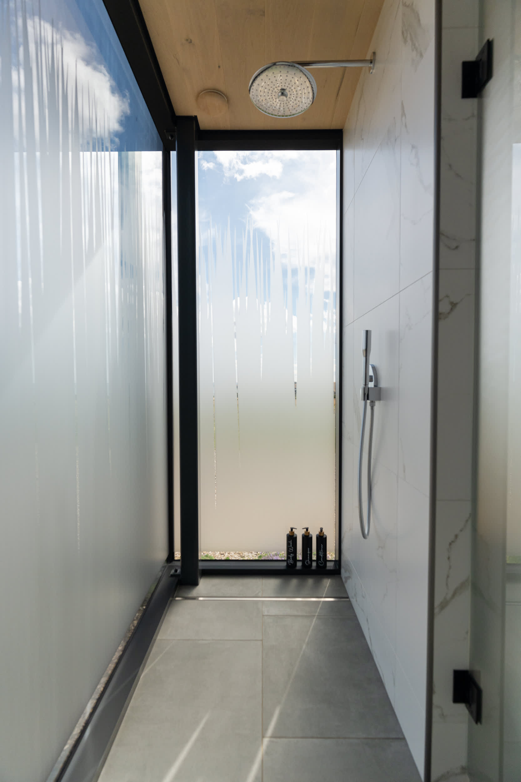 The bathroom includes a spacious walk-in shower with luxury fittings, designed for comfort and simplicity.