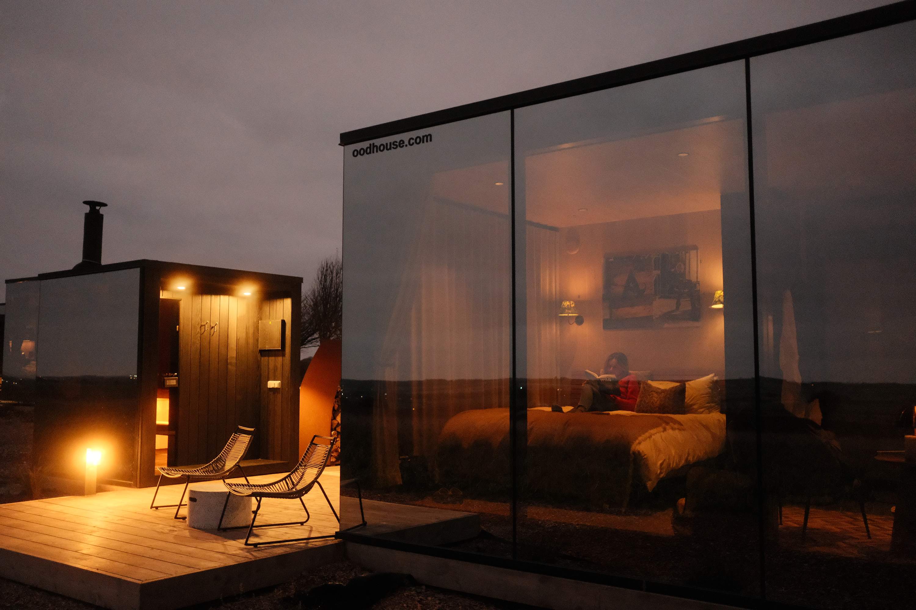 Inside, the cabin features a king-size bed, air conditioning and underfloor heating, and a compact kitchenette with one hob, suited to light meals and relaxed dining — with the barbecue ideal for evening cooking.